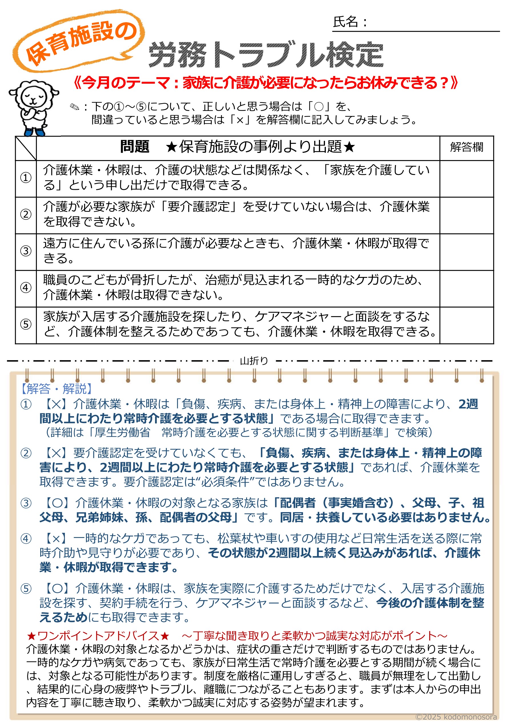 今月の『保育施設の労務トラブル検定』をお届けします。