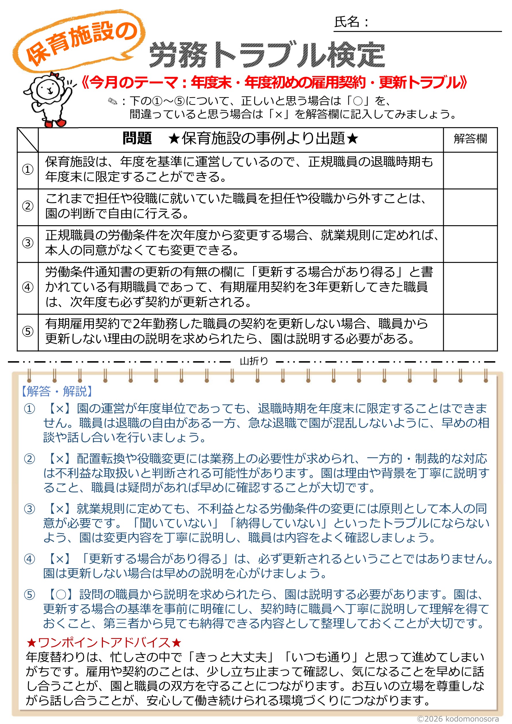 今月の『保育施設の労務トラブル検定』をお届けします。